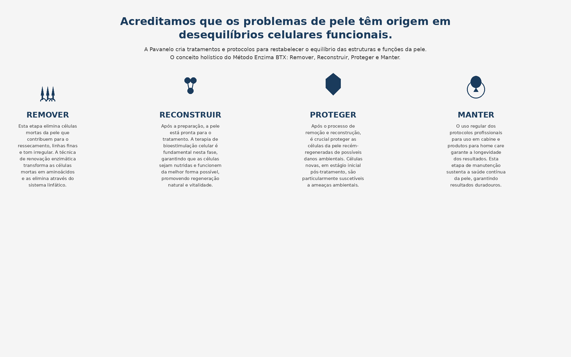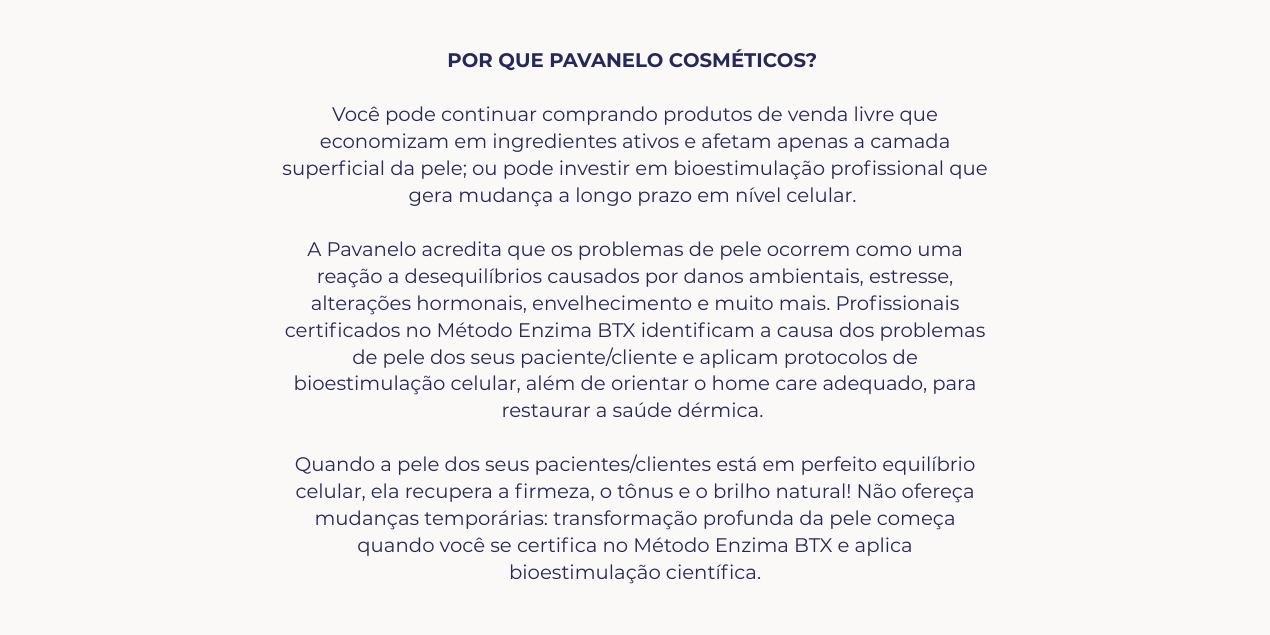 A Pavanelo utiliza bioestimulação celular profunda e ativos biocompatíveis para criar protocolos profissionais que atuam em sinergia, nutrindo a pele em nível celular como um organismo vivo que se regenera naturalmente.