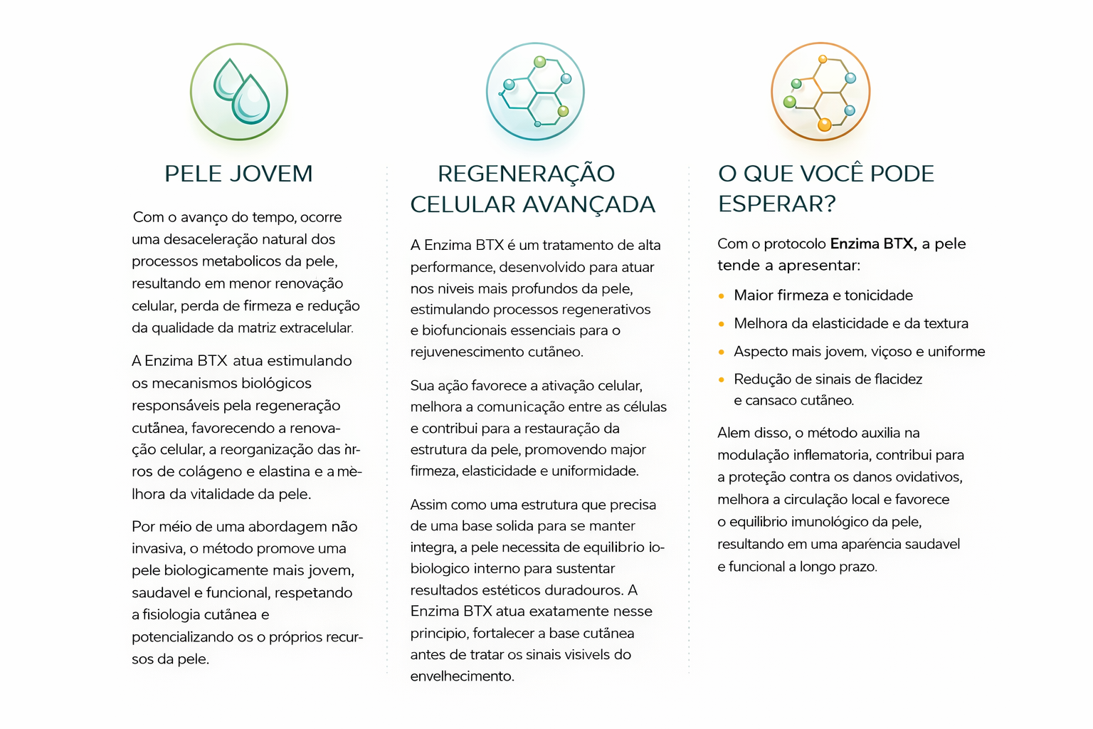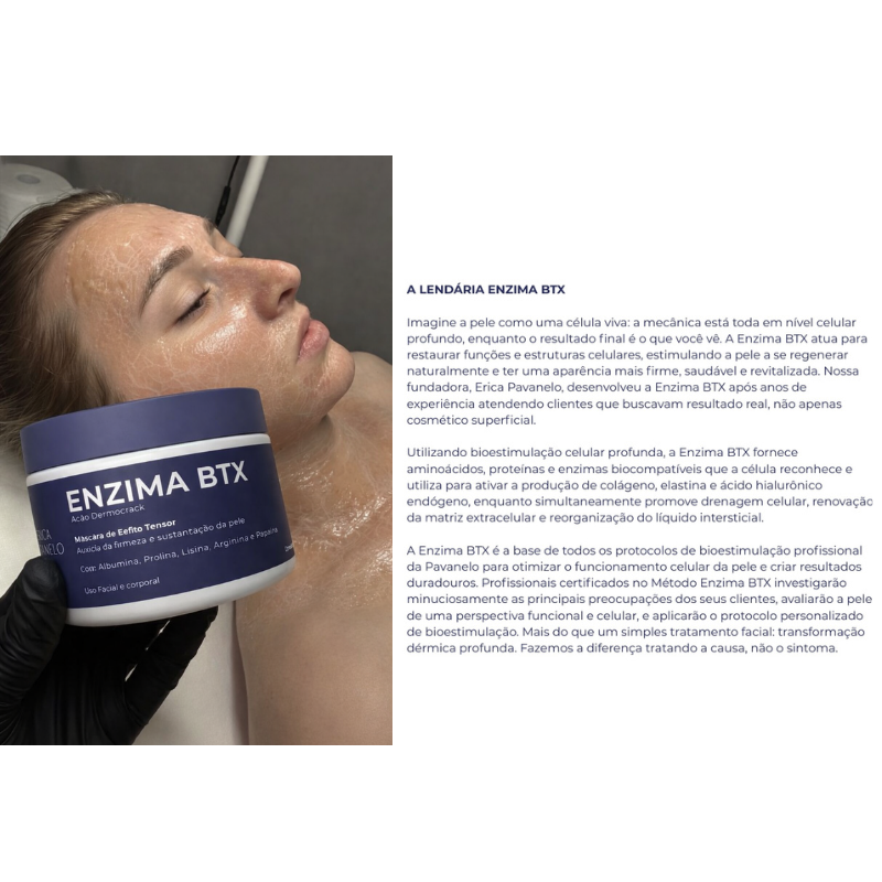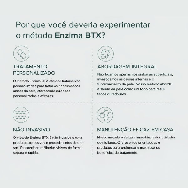 A Enzima BTX® é um tratamento de ponta para revitalização da pele que se concentra no processo de diferenciação das células-tronco. As células-tronco são os componentes básicos da pele e desempenham um papel fundamental nos processos naturais de reparo e regeneração do corpo. Através de um tratamento de 50 dias com a Terapia Enzima BTX®, é possível estimular a produção de novos fibroblastos, que produzem colágeno e elastina, promovendo firmeza e regeneração da pele, conferindo-lhe uma aparência jovem, saudável e radiante.